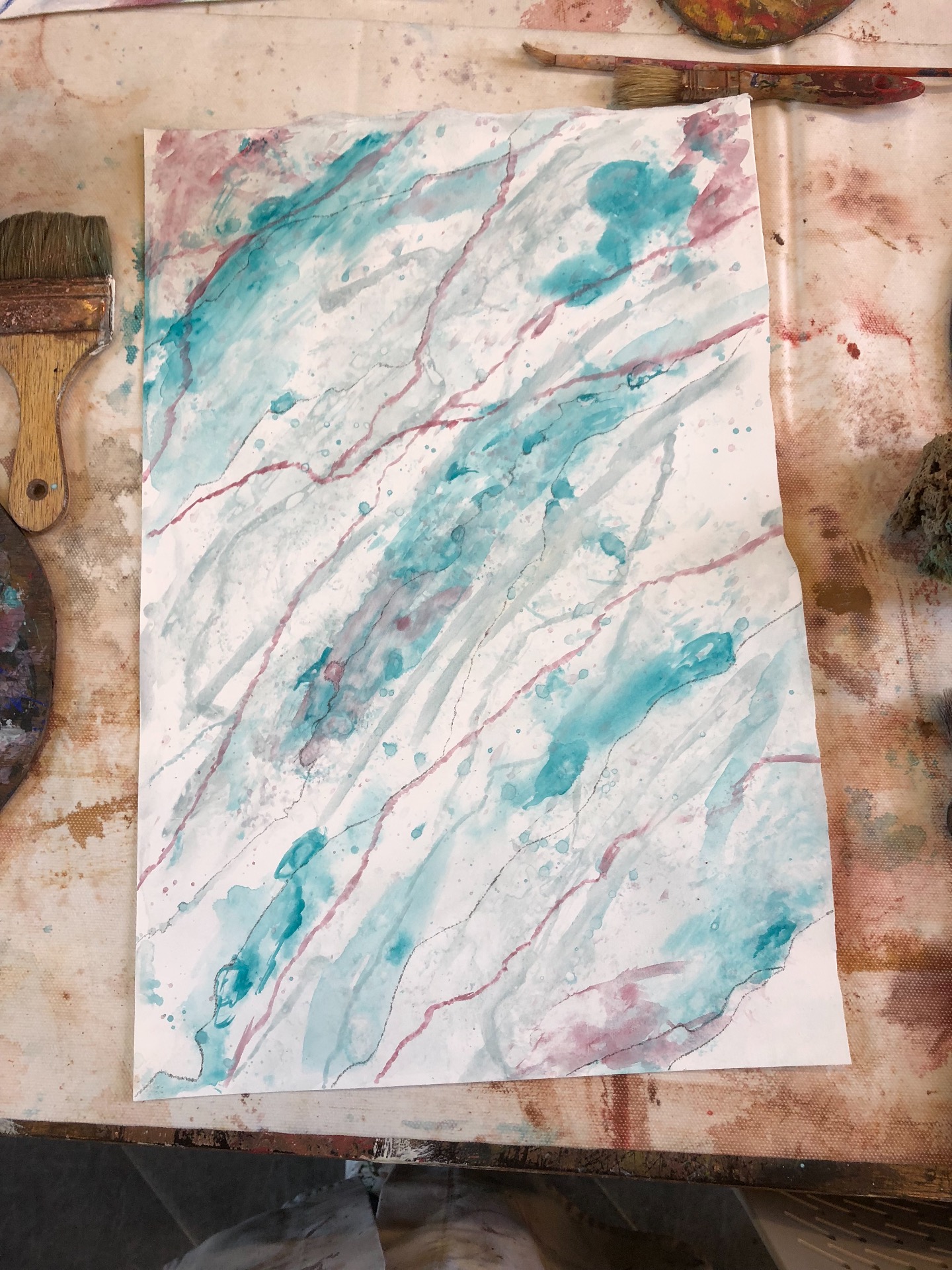 A notre arrivée, nous avons été divisés par groupes d'activité. Pour débuter la journée, la peintre nous a montré des techniques de faux marbres. Nous avons alors fait un premier essai, il était amusant de constater que nous avions tous un style différent, j'ai beaucoup aimé découvrir les créations des autres.